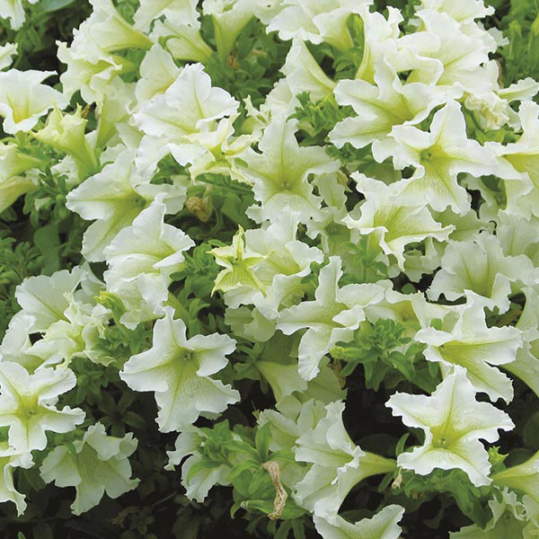 Petunia ‘Surfinia Lime’ is a spectacular cascading Grandiflora petunia, which is more weather resistant than other Grandiflora petunias. It bears large, white blooms with a lime-green blush. Petunia ‘Surfinia Lime’ is ideal for growing in containers and hanging baskets, and also makes good ground cover.